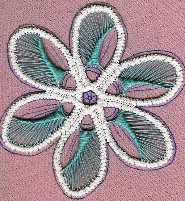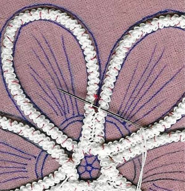 Наметку аккуратно срезаем и отсоединяем цветочек от ткани. Один из мотивов готов. Используя технику румынское кружево можно выполнять более сложные узоры. Мотивы можно объединять в единое изделие, например, скатерть, одежду, аксессуар, либо же использовать как самостоятельную работу (декор, салфетка, шнурок для штор и т.д.).