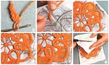 Для начала вам потребуется довольно большой планшет – настолько большой, чтобы на нём уместилась выкройка вашего будущего изделия (если деталей много, умещаться должна хотя бы одна, самая большая). Поверх выкройки укладывают мотивы лицом вниз. Располагайте их группами или поодиночке – создайте композицию на свой вкус. Затем мотивы фиксируют булавками. И после этого приступают к соединению с помощью сетки.