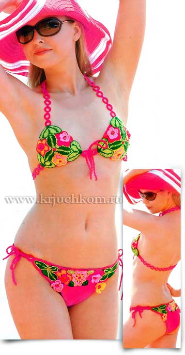 Мотивы раскладываем на выкройке, после чего сшиваем соприкасающиеся части катушечными нитками с соответствующим тоном. Обшиваем купальник по контуру красным шнуром «гусеничка». Далее делаем лиф. Раскладываем мотивы и сшиваем соприкасающиеся части. Центр цветочков оформляем стразами. Колечки обвязываем 6 столбиками без накида, а затем пришиваем их к верхним боковым углам плавок и между чашечками лифа.