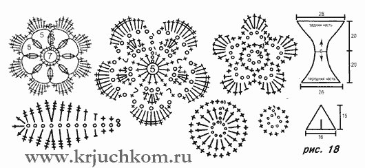 - Провязывается одна воздушная, две соединит., три с одним накидом, шесть с двумя накидами, две с тремя накидами, шесть с двумя накидами, три с одним накидом, четыре соединит петли