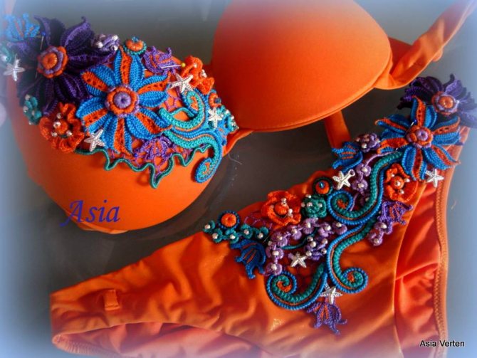 Также, с помощью ирландского кружева можно оформить готовый купальник и тем самым сделать его эксклюзивным