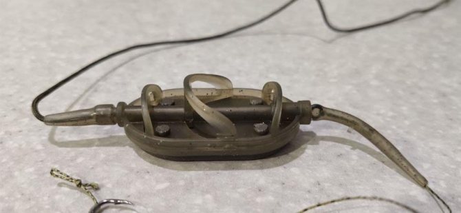 Фидергам крепится к плетенке обычным методом «петля в петлю». Затем один конец амортизатора соединяется с поводком, а другой – с кормушкой. Длина поводка будет около 45 см. При этом можно привязывать крупный крючок, но такой способ крепления называется модернизированным патерностером.