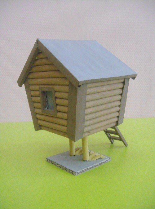 - скрутив из бумаги трубочки-бревна и собрать из них стены