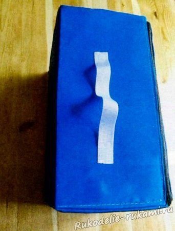 Полученную заготовку располагаем на ткани, сложенной в два слоя. Обрезаем ткань с учётом припусков. Затем кладём ткань в один слой с каждой стороны картона, к которому прикрепляем её двухсторонним скотчем. Центральную часть нужно обшить на машинке, выбирая достаточно широкий шаг стежка. Уголки, надрезав, заправить в картон. Пришить молнию к верхней и нижней части чехла, вручную пришить ручку.