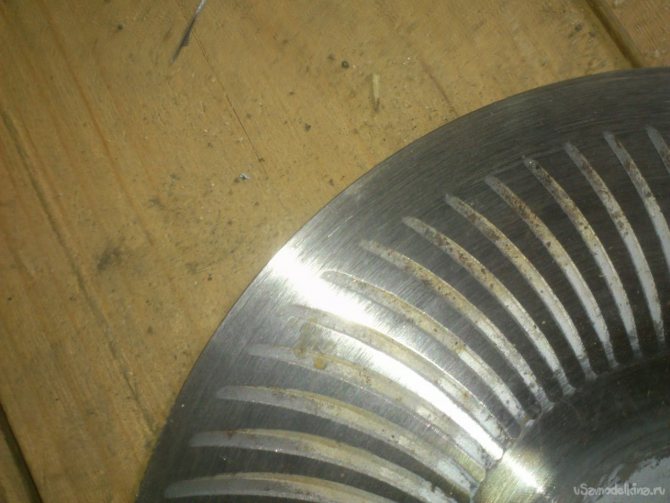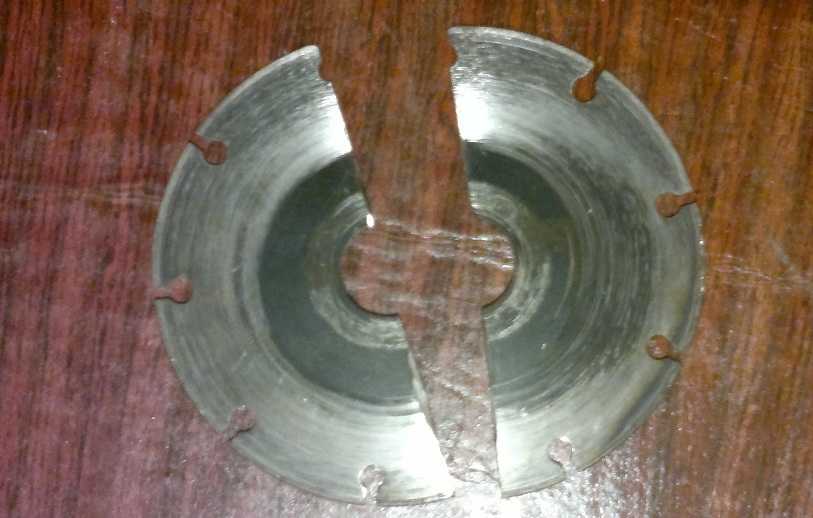 Как видим, при этом краешек лопнул и откололся. Это навело меня на мысль, что, возможно, диск выполнен из слишком хрупкой углеродистой стали, и выгнуть его должным образом не получится… Но, поразмыслив, я решил, что достаточно известный производитель оснастки вряд-ли мог сделать диск, который может при ударе лопнуть и разлететься осколками! Скорей, перекалилась только наружная часть, нагревшись до красна от сильного трения, когда закончился алмазный слой. А сама несущая часть просто таки обязана быть выполнена их более пластичного металла.