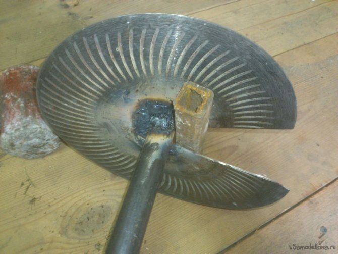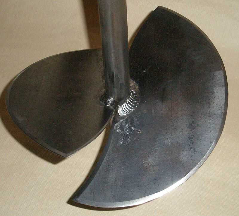 - Режущей части. Она обычно представляет собой два стальных полукруга с заточенными краями. Диаметр лопастей подбирается в зависимости от диаметра ям, которые требуется пробурить. Для удобства лопасти можно сделать съемными — на болтах.