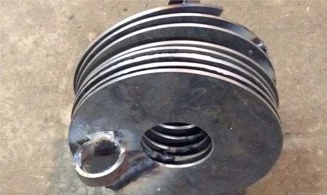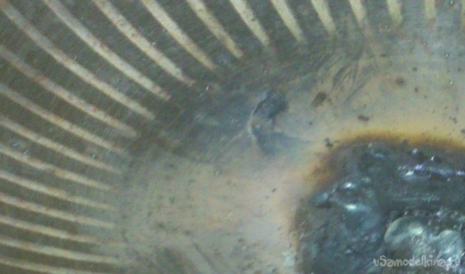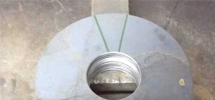 При этом выяснилось, что сваривается этот металл не особо хорошо. Пришлось сперва аккуратно наварить на самом диске расплавленного металла из электрода, а уже потом сварить этот металл с трубой.