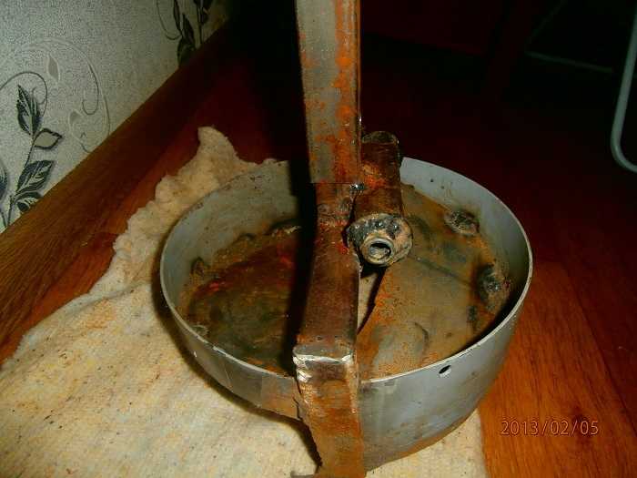 И тут у меня возникла проблема. Как я и предполагал, производитель подошёл к изготовлению очень ответственно. Различные части круга были изготовлены из разных видов металла. И сама ступица тоже была вварена каким-то методом (думаю, трением). И при отгибании основной части она треснула по кругу на половину длины своей окружности, отделившись. Удержало от полного отделения, думаю, проваренное место. (К сожалению, я был тогда сильно расстроен, потому что думал, что завершить проект не удастся. Поэтому забыл сфотографировать эту «аварию». Но мне удалось, отделив круг обратно от оси, ударом молотка вогнать отколовшуюся часть на место и , осторожными прихватками проварить эту еле заметную щель по всей окружности, после чего продолжить работу.