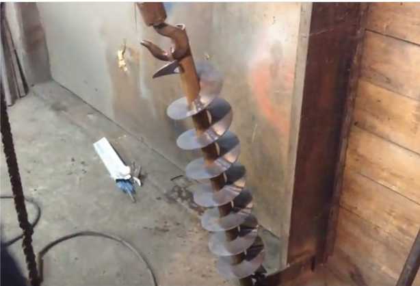 Теперь необходимо растянуть наш разрезанный диск в вертикальной плоскости и в таком положении приварить.Кроме того, что я решил придать будущему буру такие свойства, как лёгкость самой конструкции, я решил ещё и обеспечить лёгкость в работе в угоду высокой производительности. Поэтому, разницу в витках спирали я решил сделать небольшой — 25 мм. Для того, чтобы раздвинуть витки на нужное расстояние, я воспользовался шаблоном из обрезка профильной трубы, который забил между винтками: