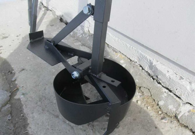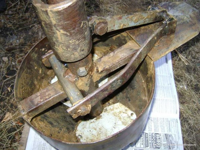 В качестве ножа тут выступает обрезанная лопата, а землеприемник сделан из банки из-под сельди. Нож закреплен подвижно, при опускании в шурф подтягивается привязанным к концу капроновым тросом. Достигнув дна, трос ослабляют, лопатка начинает подрезать бока шурфа, формируя необходимое расширение.