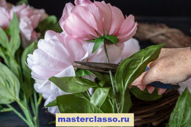 С помощью кусачек или тяжелых ножниц срежьте цветы, оставив около 7-8 см стебля. Для этого 45-сантиметрового венка мы использовали два куста искусственных пионов. На каждом из них было по 8 цветов.