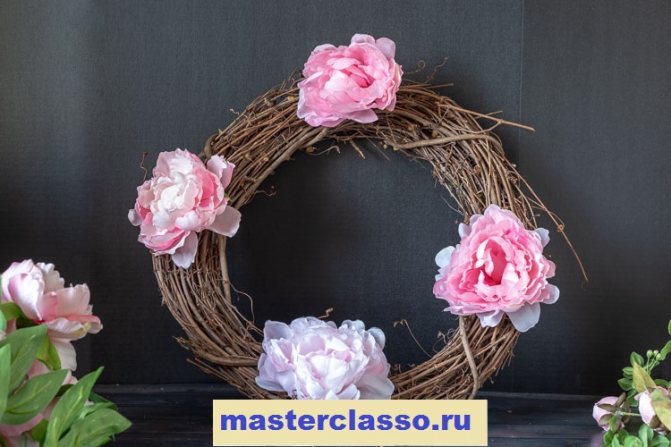 С помощью крепкой проволоки равномерно прикрепите на венок четыре цветка пиона.