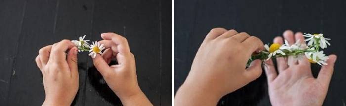 Вначале берётся два цветка: один кладётся вертикально, второй – поперёк, как можно ближе, и сгибается вокруг первого. Также совершаются манипуляции с остальными цветами до получения необходимой длины. Конец соединяется с началом и закрепляется ниткой, лентой.