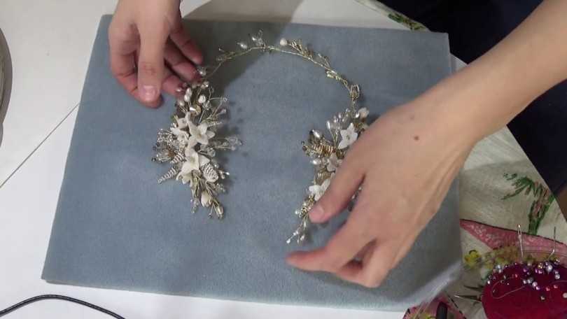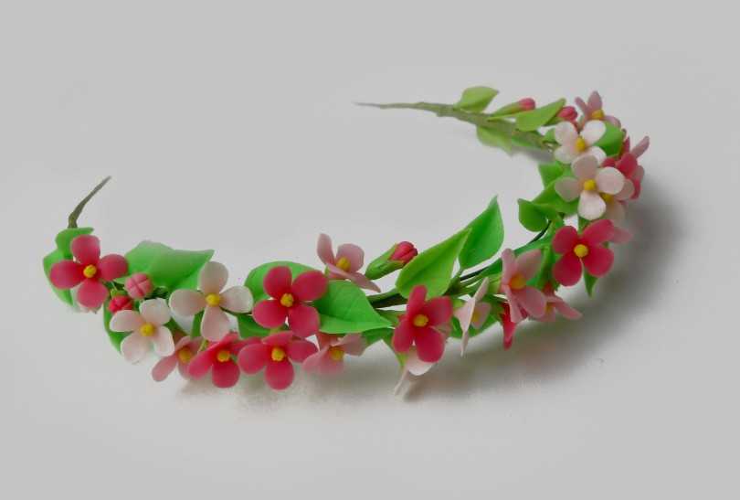 Для такого особенного тонкого декорированного ободка используются мелкие цветы, листья, плоды. Их можно сформировать из: страз, жемчужин, полимерной глины, ткани, золотых ниток. Особенностью является то, что только одна сторона декорируется, спереди или сзади.