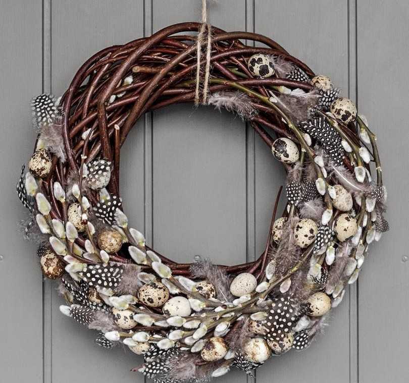 Его главная особенность – наличие композиции символов праздника Светлой Пасхи. Он украшается расписными и крашенными яйцами, фигурками цыплят и кроликов, гнёздами птиц, зеленью, тюльпанами, нарциссами, ландышами, перьями, мхом и яичной скорлупой. Используются 3 основных цвета: зелёный, красный и жёлтый.
