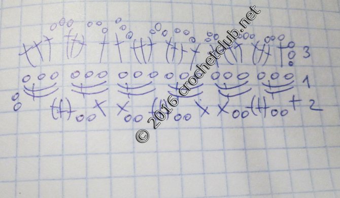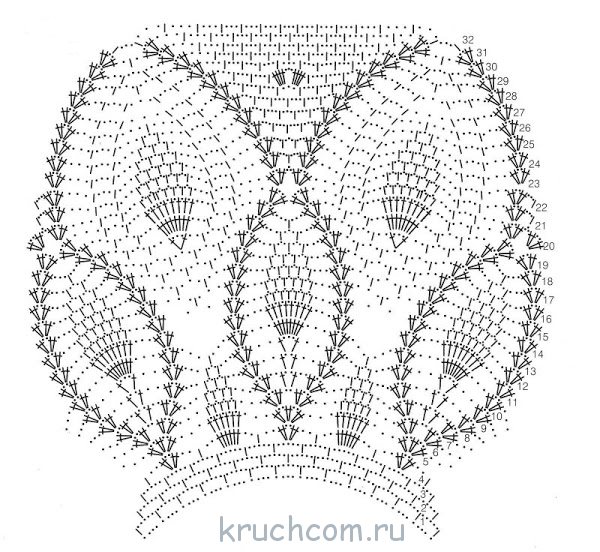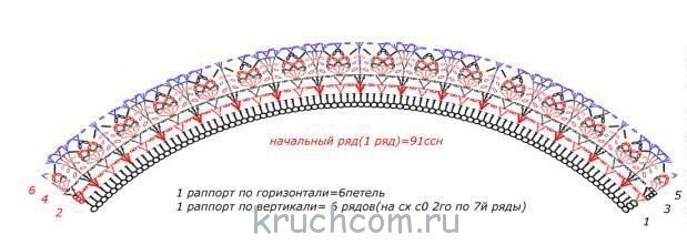 Ряд №1: 4 ВП, 2 ССН в след. ВП, далее раппорты до конца ряда: пропускаем 3 ВП и выполняем 2 ССН в след. ВП, + 1 ВП, в след. петельку вяжем 2 ССН + 1 ВП. Заканчиваем ряд, пропуская 3 ВП, затем вяжем 1 ССН в ту же петельку, что и первую ВП ряда, замыкаем ряд СС в третью ВП от начала ряда. Продолжаем работу по кругу узором согласно схемы кокетки.