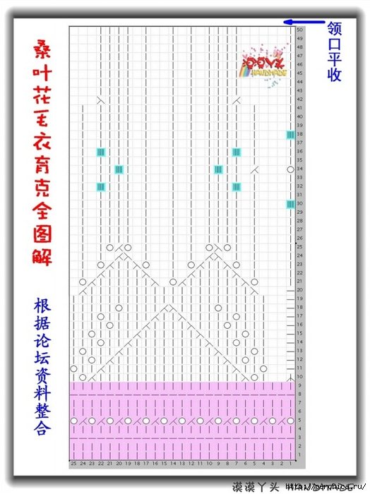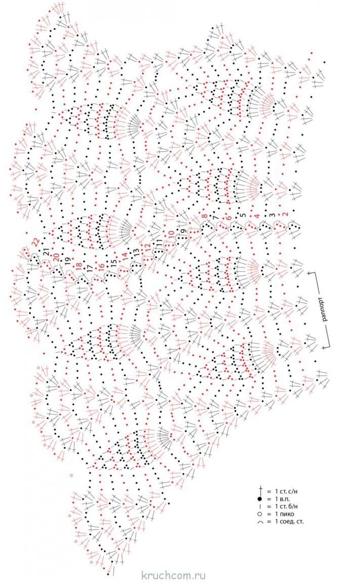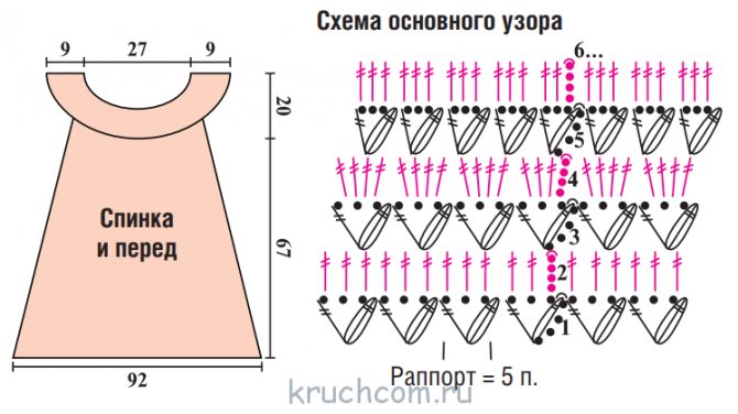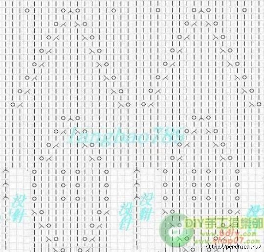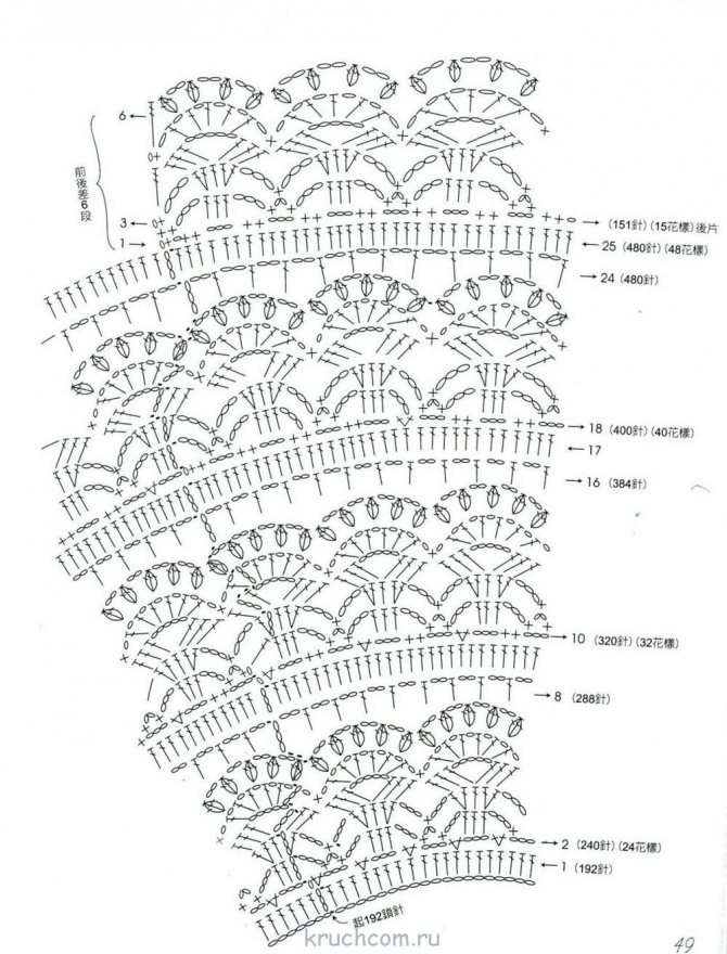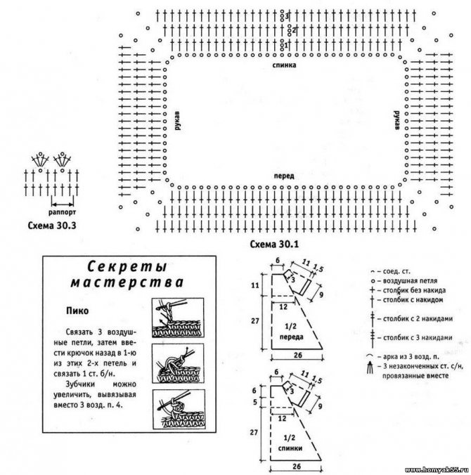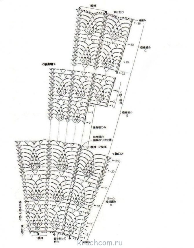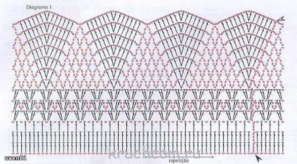 Затем 15 рядов вяжем по схеме низа. При необходимости их количество можно увеличить для получения нужной длины изделия. Проймы, края полочек и горловину обвязываем по соответствующей схеме.