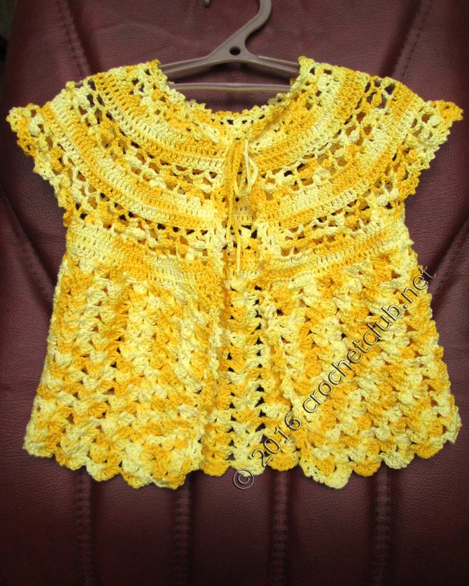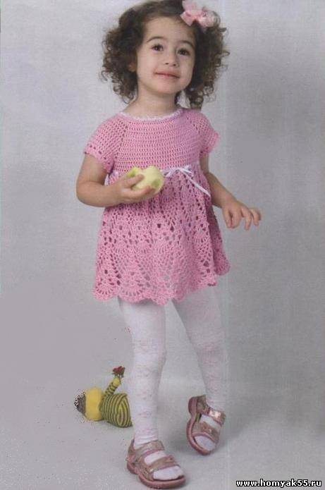 Летний вариант вязанного платья, в котором используется квадратная кокетка крючком. Неоспоримыми плюсами данного изделия является элегантный дизайн и 100% воздухопроницаемость. Даже в самые жаркие дни малышка не испытает никакого дискомфорта