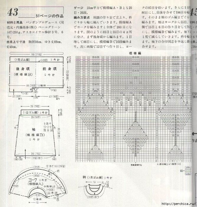 Для кокетки на круговые спицы набираем 176пет. и вяжем резинкой 2 см. Далее необходимо связать 44 раппорта по схеме 16.1, выполняя указанное прибавление и убавление петель. После выполнения этого узора должно получиться 308 пет. Теперь делим их на детали, отмечая точками. Для переда и спинки отделяем по 92 пет., а для рукавов – по 62пет. Вяжем, прибавляя по 1 пет. с обеих сторон линии изделия в каждом 2-ом ряду, 6 раз. В результате должно получиться 356 пет. Теперь вяжем лицевой гладью 13 рядов, после чего отделяем по 104 пет. для спинки и переда, и по 74 пет. для рукавов.