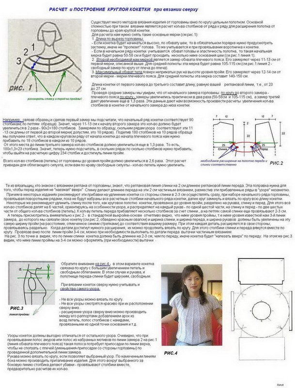 - от горловины вниз, т.е. сначала вяжется сама кокетка и все дальнейшее вязание строится на её нижнем крае, от которого продолжаются рукава, спинка и перед изделия;