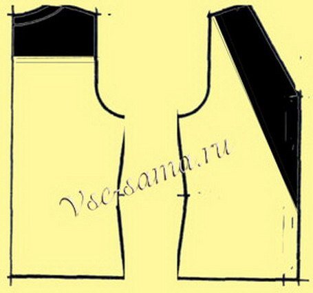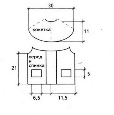 Её начинают вязать снизу: набрать 3 петли и вязать по выкройке и по узору с прибавлениями (накиды). Острота угла кокетки зависит от того, какое количество накидов будет сделано. Прибавления выполняются в конце ряда. Прибавления необходимо выполнять до горловины. Далее найти и отметить середину ряда. Одну половину петель снять на дополнительную спицу, а вторую часть вязать по выкройке. Таким образом, закрывается часть петель на горловину, и вывязываются плечо и скосы. Далее закрыть петли последнего ряда и вязать горловину, плечо и скос на второй половине петель (вторая половинка изделия). Все петли закрыть и кокетку пришить с изн. стороны к изделию.