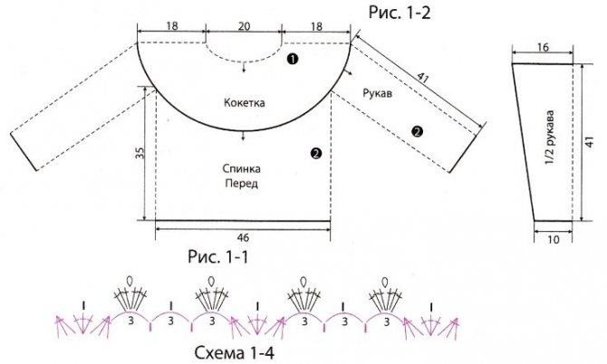 Рукава. Начинаем их вязать в проймах по схеме 1-2 сверху-вниз, начиная от края кокетки. Когда рукава достигнут нужной длины, их край необходимо обвязать узором схемы 1-4