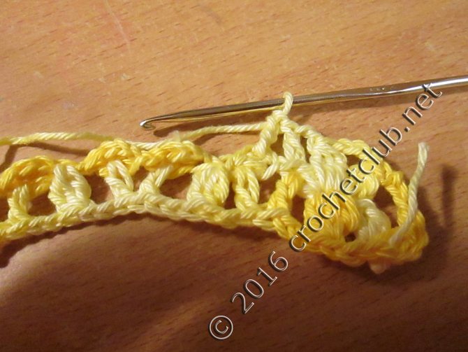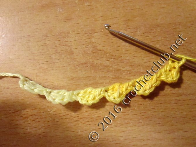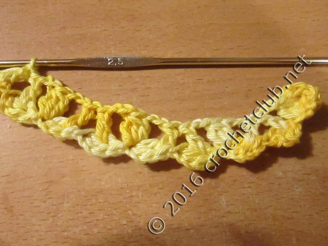 Ряд №1: захватив конец нити, ввязываем за кольцо из ВП 1 СБН, затем вяжем раппортами: 3 ВП + 1 СБН, должно получиться 4 арки из ВП.