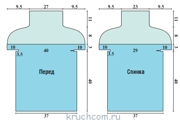 Вязание крючком будем выполнять по направлению сверху-вниз. Набираем цепочку из 90 воздушных петель и далее вяжем ССН прямыми и обратными рядами: 15 пет. спинки, 2 ВП, 15 пет. рукава, 2 ВП, 30 пет. переда, 2 ВП, 15 пет. рукава, 2 ВП, 15 пет. спинки. Благодаря такой схеме, в результате мы получим разрез для застёжки на спинке.