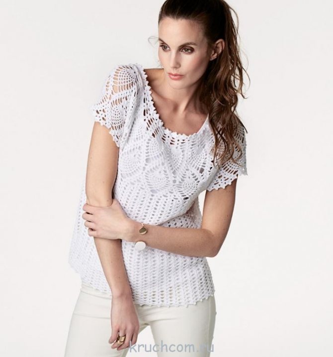 Любимый многими «ананасовый узор» продолжает покорять сердца рукодельниц – процесс его вязания нельзя назвать сверхсложным, а результаты радуют невероятной красотой. Ананасы, вывязанные крючком, шикарно смотрятся на кокетках, более того, к завершению такого узора удобно подсоединять любое другое вязание, предназначенное для изготовления спинки и переда изделия (ажуры, филе, мотивы). Предлагаем рассмотреть пошагово этапы вязания кокетки «в ананасах» цельным полотном.