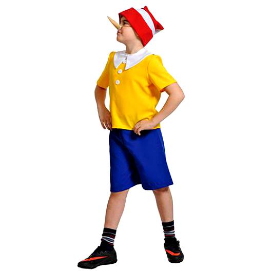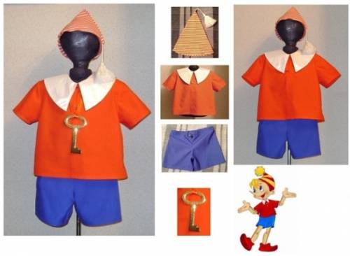 Костюм Пиноккио не сильно отличается от наряда его коллеги Буратино, но все же есть некоторые отличия. Одним из главных отличий является головной убор. У Пиноккио шапка имеет форму, как у Робин Гуда и ярко желтый или оранжевый цвет.