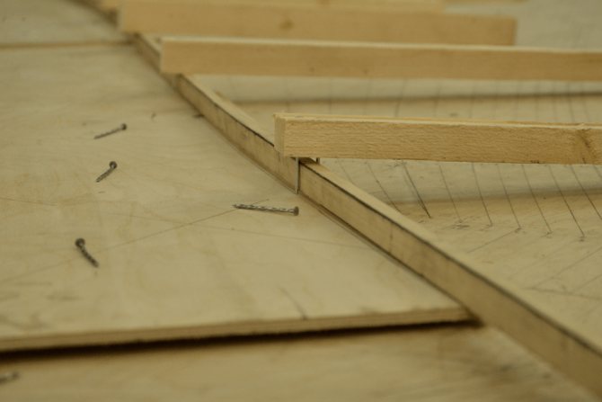 Теперь нужно перенести линию шпангоута с плазы на заготовку шаблона. Заготовку сдвигают в сторону. На стол возвращают рейку-лекало, с помощью которой рисовали линию. Из деревянных брусков и гвоздей изготавливают специальные фиксаторы. Используя их, устанавливают рейку по линии шпангоута. Чтобы не было ошибки, стараются конец фиксатора, который держит рейку, расположить в месте, где были забиты гвозди при рисовании линии.
