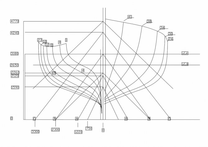 Расчерчивали её линиями секущих плоскостей и мерили. Получалась система координат. Линии секущих плоскостей называются шпангоутами, ватерлиниями, батоксами. Нас интересуют плоскости мидель-шпангоута и линии, которые получились в результате пересечения этих плоскостей с оболочками корпуса — линии шпангоутов.