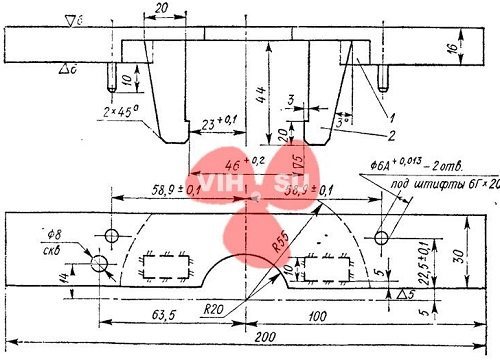 Приспособление для удержания коленчатого вала при затяжке стяжного болта 1 – пластина, столь Ст.3; 2 – упор, стал Ст.3