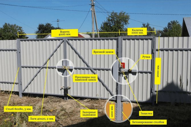 Схема ворот с калиткой из профнастила со врезным замком